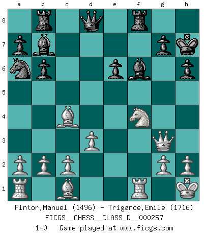 Last move : 1-0 2019 September 25 18:49:11 [Event "FICGS__CHESS__CLASS_D__000257"] [Site "FICGS"] [Date "2019.09.18"] [Round "1"] [White "Pintor,Manuel"] [Black "Trigance,Emile"] [Result "1-0"] [WhiteElo "1496"] [BlackElo "1716"] 1.e4 c5 2.f4 d5 3.exd5 Qxd5 4.Nc3 Qd8 5.Nf3 Nf6 6.Bc4 e6 7.d3 Be7 8.O-O O-O 9.Kh1 Ng4 10.Ne4 Nf6 11.Nfg5 Nd5 12.Qh5 h6 13.Nh3 Nf6 14.Nxf6+ Bxf6 15.Qxc5 b6 16.Qh5 Na6 17.Qf3 Rb8 18.Qg3 Bb7 19.f5 Kh7 20.fxe6 fxe6 21.Nf4 1-0 Sicilian : Grand Prix attack Kingside Castling by player White (move 8) Kingside Castling by player Black (move 8) Player White won this chess game. Follow this game move after move (download)A Chess game is divided into three stages: the first, when you hope you have the advantage, the second when you believe you have an advantage, and the third... when you know you're going to lose ! (Savielly Tartakower) Ich kenne Menschen, die allen Willen der Welt besitzen und doch nicht Schach spielen können. (Robert James Fischer) Una partida de Ajedrez se divide en 3 etapas: la primera cuando piensas que tienes la ventaja, la segunda cuando crees que tienes la ventaja y la tercera... ¡cuando te das cuenta que vas a perder!. (Savielly Tartakower) Karpov est une pièce de musée. (Garry Kasparov) You can only get smarter by playing a smarter opponent. (Revolver, movie)
