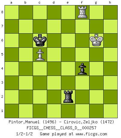 Last move : 1/2-1/2 2019 November 16 17:20:45 [Event "FICGS__CHESS__CLASS_D__000257"] [Site "FICGS"] [Date "2019.09.18"] [Round "1"] [White "Pintor,Manuel"] [Black "Cirovic,Zeljko"] [Result "1/2-1/2"] [WhiteElo "1496"] [BlackElo "1472"] 1.e4 c5 2.f4 Nc6 3.Nf3 e6 4.d4 cxd4 5.Nxd4 Nxd4 6.Qxd4 Qf6 7.e5 Qh4+ 8.g3 Qe7 9.Be3 Qb4+ 10.Qxb4 Bxb4+ 11.c3 Ba5 12.Nd2 Ne7 13.Bc5 Bb6 14.Bd6 Nf5 15.O-O-O Nxd6 16.exd6 Be3 17.Bd3 a6 18.Kc2 Bxd2 19.Rxd2 f5 20.Re1 Kf7 21.h3 b5 22.g4 g6 23.g5 Bb7 24.h4 Rac8 25.Kb3 h6 26.R1e2 hxg5 27.hxg5 Bd5+ 28.Ka3 Rc6 29.Rh2 Rxh2 30.Rxh2 Kg7 31.Kb4 Rxd6 32.b3 Bxb3 33.Bxb5 Bxa2 34.Bxd7 Rxd7 35.Rxa2 Rd6 36.Kc5 Rd3 37.c4 Rf3 38.Rxa6 Rxf4 39.Rxe6 Rg4 40.Re7+ Kf8 41.Rc7 Rxg5 42.Kd6 Rg2 43.Ke6 Ra2 44.c5 Re2+ 45.Kf6 Ke8 46.Kxg6 f4 47.Rc8+ Kd7 48.Rf8 Kc6 1/2-1/2 Sicilian : Grand Prix attack Queenside Castling by player White (move 15) 10 pieces endgame at move 38 : White KRPPP , Black KRPPP WHITE : King + 1 Rook 3 Pawns BLACK : King + 1 Rook 3 Pawns 9 pieces endgame at move 38 : White KRPP , Black KRPPP WHITE : King + 1 Rook 2 Pawns BLACK : King + 1 Rook 3 Pawns 8 pieces endgame at move 39 : White KRPP , Black KRPP WHITE : King + 1 Rook 2 Pawns BLACK : King + 1 Rook 2 Pawns 7 pieces endgame at move 41 : White KRP , Black KRPP WHITE : King + 1 Rook 1 Pawn BLACK : King + 1 Rook 2 Pawns 6 pieces endgame at move 46 : White KRP , Black KRP WHITE : King + 1 Rook 1 Pawn BLACK : King + 1 Rook 1 Pawn This chess game ended in a draw. Follow this game move after move (download)Life is a kind of Chess, with struggle, competition, good and ill events. (Benjamin Franklin) Ein Kibitz ist einer, der deinem Gegner gute Ratschläge gibt. (Andrew Soltis) Antes de los Finales, los dioses han colocado el Juego Medio. (Siegbert Tarrasch) Le génie consiste à savoir transgresser les règles au moment opportun. (Teichmann) Nobody is always a winner, and anybody who says he is, is either a liar or doesn't play poker. (Amarillo Slim)