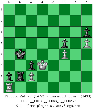 Last move : 0-1 2019 November 18 7:57:8 [Event "FICGS__CHESS__CLASS_D__000257"] [Site "FICGS"] [Date "2019.09.18"] [Round "1"] [White "Cirovic,Zeljko"] [Black "Zaunercik,Ilmar"] [Result "0-1"] [WhiteElo "1472"] [BlackElo "1439"] 1.e4 e5 2.Nf3 Nc6 3.Bb5 a6 4.Bxc6 dxc6 5.d4 exd4 6.Qxd4 Qxd4 7.Nxd4 Nf6 8.Nc3 Bb4 9.O-O O-O 10.e5 Ng4 11.Bf4 Re8 12.Nf3 Bf5 13.Rac1 Rad8 14.h3 Nh6 15.Bxh6 gxh6 16.a3 Bxc3 17.bxc3 c5 18.g4 Be4 19.Kg2 Rxe5 20.Kg3 Red5 21.Rfe1 Bg6 22.Re7 R5d7 23.Rxd7 Rxd7 24.Ne5 Rd2 25.Nxg6 hxg6 26.Kf3 Kg7 27.Ke3 Rd5 28.f4 c4 29.Rb1 b6 30.Rb4 b5 31.a4 c6 32.axb5 cxb5 33.Rb1 Kf6 34.Ra1 Rd6 35.h4 Ke6 36.Ke4 f5+ 37.gxf5+ gxf5+ 38.Ke3 Kd5 39.h5 Re6+ 40.Kf3 Kc5 41.Rg1 a5 42.Rg6 Rd6 43.Ke3 a4 44.Rg1 a3 45.Ra1 b4 46.cxb4+ Kxb4 47.Ke2 c3 48.Ke3 Rd2 49.Ra2 Rd1 50.Ke2 Rb1 51.Kd3 Rb2 52.Ra1 a2 0-1 Ruy Lopez : Exchange variation Kingside Castling by player White (move 9) Kingside Castling by player Black (move 9) Player Black won this chess game. Follow this game move after move (download)No Chess Grandmaster is normal; they only differ in the extent of their madness. (Viktor Korchnoi) Bis zum Jahr 1971 verlief in meiner Schachkariere alles glatt. Dieses dramatische Match [Fischer-Taimanov 6:0] machte mein Leben zur Hölle. (Mark Taimanov) Bobby Fischer es el jugador de Ajedrez mas grande que jamás haya existido. (Ken Smith) On croit qu'il y a plus de mauvais joueurs que de bons joueurs, c'est faux : Il y a autant de joueurs qui gagnent que de joueurs qui perdent. (Philippe Geluck) Life is pain my dear and anyone who says otherwise is selling something. (Princess Bride)