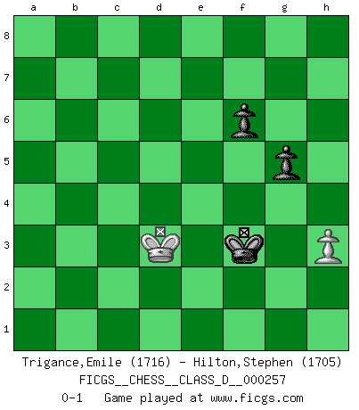 Last move : 0-1 2019 November 2 13:48:13 [Event "FICGS__CHESS__CLASS_D__000257"] [Site "FICGS"] [Date "2019.09.18"] [Round "1"] [White "Trigance,Emile"] [Black "Hilton,Stephen"] [Result "0-1"] [WhiteElo "1716"] [BlackElo "1705"] 1.a3 g6 2.e4 Bg7 3.d4 d6 4.Nf3 Nf6 5.Nc3 O-O 6.h3 c5 7.Be2 cxd4 8.Nxd4 a6 9.O-O Bd7 10.Be3 Nc6 11.Nb3 b5 12.Bf3 Ne5 13.Rb1 Nxf3+ 14.Qxf3 Bc6 15.Rfd1 Qc8 16.Na5 Qc7 17.Nxc6 Qxc6 18.Bd4 Rac8 19.Rd2 Rfe8 20.Rbd1 Nd7 21.Bxg7 Kxg7 22.Nd5 Nb6 23.Nb4 Qb7 24.b3 a5 25.Nd3 Rc3 26.Qe2 Rec8 27.Nf4 Qc6 28.Nd5 Nxd5 29.exd5 Qc7 30.Qxb5 Rxc2 31.Rxc2 Qxc2 32.Qd3 Qb2 33.Qe3 Rc2 34.b4 axb4 35.axb4 Qxb4 36.Qxe7 Qb2 37.Rf1 Qb6 38.Qe1 Qd4 39.Qa1 Qxa1 40.Rxa1 Rd2 41.Ra5 Kf6 42.f4 Kf5 43.Ra7 f6 44.Rxh7 Kxf4 45.Rf7 Ke5 46.Rg7 g5 47.Re7+ Kxd5 48.Rf7 Ke6 49.Ra7 Rd5 50.Ra6 Rc5 51.Kf2 Ke5 52.Ke3 d5 53.Kd3 d4 54.Ra8 Rc3+ 55.Kd2 Rg3 56.Re8+ Kf5 57.Re2 d3 58.Rf2+ Ke5 59.Rf3 Rxf3 60.gxf3 Kf4 61.Kxd3 Kxf3 0-1 Anderssen's Opening Kingside Castling by player Black (move 5) Kingside Castling by player White (move 9) 10 pieces endgame at move 44 : White KRPPP , Black KRPPP WHITE : King + 1 Rook 3 Pawns BLACK : King + 1 Rook 3 Pawns 9 pieces endgame at move 47 : White KRPP , Black KRPPP WHITE : King + 1 Rook 2 Pawns BLACK : King + 1 Rook 3 Pawns 8 pieces endgame at move 59 : White KPP , Black KRPPP WHITE : King + 2 Pawns BLACK : King + 1 Rook 3 Pawns 7 pieces endgame at move 60 : White KPP , Black KPPP WHITE : King + 2 Pawns BLACK : King + 3 Pawns 6 pieces endgame at move 61 : White KPP , Black KPP WHITE : King + 2 Pawns BLACK : King + 2 Pawns 5 pieces endgame at move 61 : White KP , Black KPP WHITE : King + 1 Pawn BLACK : King + 2 Pawns Player Black won this chess game. Follow this game move after move (download)No other master has such a terrific will to win. At the board he radiates danger, and even the strongest opponents tend to freeze, like rabbits when they smell a panther. Even his weaknesses are dangerous. As white, his opening game is predictable - you can make plans against it - but so strong that your plans almost never work. In the middle game his precision and invention are fabulous, and in the end game you simply cannot beat him. (Anonymous German Expert) Sitze auf Deine Hände. (Siegbert Tarrasch) El Ajedrez es en su esencia, un juego. En su forma, un arte. Y en su ejecución, una ciencia. (Baron Tassilo) Le succès, c'est être capable d'aller d'échec en échec sans perdre son enthousiasme. (Winston Churchill) Wisdom doesn't necessarily come with age. Sometimes age just shows up all by itself. (Tom Wilson)