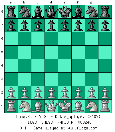 Last move : 0-1 2019 October 20 8:46:4 [Event "FICGS__CHESS__RAPID_A__000246"] [Site "FICGS"] [Date "2019.09.19"] [Round "1"] [White "Dama,Kartavya"] [Black "Duttagupta,Aniruddha"] [Result "0-1"] [WhiteElo "1900"] [BlackElo "2109"] 0-1 This chess game has been lost on time (started : 2019.09.19 23:43:24) Player Black won this chess game. Follow this game move after move (download)I look one move ahead... the best ! (Siegbert Tarrasch) Ich möchte Schüler heranbilden, die das Vermögen haben, selbst zu denken und Kritik zu üben. (Emanuel Lasker) Ciertamente, de todas la drogas del mundo, el Ajedrez debe ser el mas placentero permamentemente. (Assiac) Roi des jeux et jeu des rois, les échecs portent en eux un sentiment d'infini. Ils donnent à celui qui s'est efforcé d'en approfondir les arcanes l'impression de n'être pas à la mesure de l'homme; en fait, ils constituent un résumé de l'univers, un microcosme, et figurent cette grande échelle qui, dans les plans de la lumière descend jusqu'à la matière, qui des abîmes insondables remonte jusqu'en l'infini de Dieu. (Pyrame) Have no fear of perfection - you'll never reach it. (Salvador Dali)