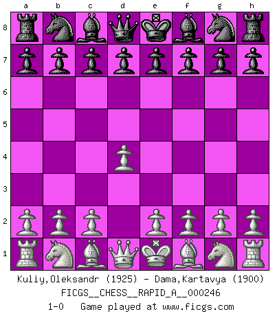 Last move : 1-0 2019 October 21 11:8:24 [Event "FICGS__CHESS__RAPID_A__000246"] [Site "FICGS"] [Date "2019.09.19"] [Round "1"] [White "Kuliy,Oleksandr"] [Black "Dama,Kartavya"] [Result "1-0"] [WhiteElo "1925"] [BlackElo "1900"] 1.d4 1-0 This chess game has been lost on time (started : 2019.09.19 23:43:24) Queen's pawn Player White won this chess game. Follow this game move after move (download)When I have White, I win because I am white; When I have Black, I win because I am Bogolyubov. (Bogolyubov) Die Auseinandersetzung mit Karpow war politisch geprägt. Er stand für das kommunistische System, wurde von dessen Repräsentanten gehätschelt. Ich war der Oppositionelle. Jeder Schachweltmeister spiegelt auch die gesellschaftlichen Verhältnisse wider. Kramnik steht für die Börsen-Generation des Neuen Markts, ideologiefrei, zahlenfixiert. (Garry Kasparov) El jugador táctico debe saber que hacer cuando algo se debe de hacer. El estratégico debe saber que hacer cuando nada se debe de hacer. (Savielly Tartakover) Un journaliste : 'Vous préférez avoir une dame de plus sur l'échiquier ou au lit ?' Boris Spassky : 'Ca dépend de la position.' Somehow our devils are never quite what we expect when we meet them face to face. (Nelson DeMille)
