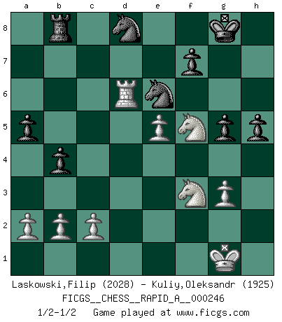 Last move : 1/2-1/2 2019 December 6 9:47:23 [Event "FICGS__CHESS__RAPID_A__000246"] [Site "FICGS"] [Date "2019.09.19"] [Round "1"] [White "Laskowski,Filip"] [Black "Kuliy,Oleksandr"] [Result "1/2-1/2"] [WhiteElo "2028"] [BlackElo "1925"] 1.e4 e6 2.d4 d5 3.Nc3 Nf6 4.e5 Nfd7 5.f4 c5 6.Nf3 Nc6 7.Be3 a6 8.Qd2 b5 9.dxc5 Bxc5 10.Bxc5 Nxc5 11.Bd3 Qb6 12.Qf2 b4 13.Ne2 a5 14.O-O Ba6 15.Rfd1 O-O 16.f5 exf5 17.Bxa6 Rxa6 18.Rxd5 Ne6 19.Qxb6 Rxb6 20.Rd6 Rd8 21.Rad1 Rb5 22.Rxd8+ Ncxd8 23.Ned4 Rc5 24.Rd2 f4 25.Nb3 Rb5 26.Rd6 g5 27.Nbd4 Rb8 28.g3 fxg3 29.hxg3 h5 30.Nf5 1/2-1/2 French : Steinitz, Boleslavsky variation Kingside Castling by player White (move 14) Kingside Castling by player Black (move 15) This chess game ended in a draw. Follow this game move after move (download)A big shock; the best chess player in history has passed away. (Lajos Portisch, about Bobby Fischer's death) Ich moechte nie einem Club beitreten, der Leute wie mich als Mitglieder aufnimmt. (Woody Allen) No nos podemos resistir a la fascinación de un sacrificio ya que la pasión por los sacrificios es parte de la naturaleza de un jugador de Ajedrez. (Rudolf Spielman) Karpov est une pièce de musée. (Garry Kasparov) If you are good, you will be assigned all the work. If you are really good, you will get out of it. (Dan Rotaru)