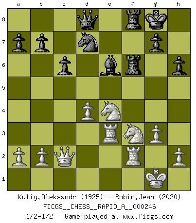 Last move : 1/2-1/2 2019 October 17 21:7:1 [Event "FICGS__CHESS__RAPID_A__000246"] [Site "FICGS"] [Date "2019.09.19"] [Round "1"] [White "Kuliy,Oleksandr"] [Black "Robin,Jean"] [Result "1/2-1/2"] [WhiteElo "1925"] [BlackElo "2020"] 1.d4 Nf6 2.c4 e6 3.Nc3 d5 4.cxd5 exd5 5.Bg5 Be7 6.e3 h6 7.Bh4 O-O 8.Bd3 Re8 9.Nf3 c6 10.O-O Ne4 11.Bxe7 Qxe7 12.Bxe4 dxe4 13.Nd2 f5 14.Qc2 Be6 15.Rae1 Nd7 16.f3 exf3 17.Nxf3 Rf8 18.e4 fxe4 19.Nxe4 Rf4 20.Rf2 Raf8 21.Re3 Qd8 22.g3 R4f7 23.Nd6 Rf6 24.Ne4 1/2-1/2 Queen's pawn game Kingside Castling by player Black (move 7) Kingside Castling by player White (move 10) This chess game ended in a draw. Follow this game move after move (download)There is no remorse like the remorse of Chess. (H. G. Wells) Ich kämpfe solange mein Gegner einen Fehler machen kann. (Emanuel Lasker) El juego del Ajedrez no es solamente una diversión quieta; algunas cualidades muy valuables de la mente se pueden adquirir y cultivar con el, como convertirlos en habitos disponibles para toda ocasión; ya que la vida es algo así como el Ajedrez. (Benjamin Franklin) Le pion, dans sa simplicité, marche droit devant lui, mais lorsqu'il prend, il le fait obliquement? Ainsi l'homme, tant qu'il reste pauvre, marche dans la droiture et vit honnêtement, mais lorsqu'il recherche les honneurs, il flatte, se parjure et, par les voies obliques, cherche une position supérieure sur l'échiquier du monde. (Jean de Galles) All art requires courage. (Anne Tucker)