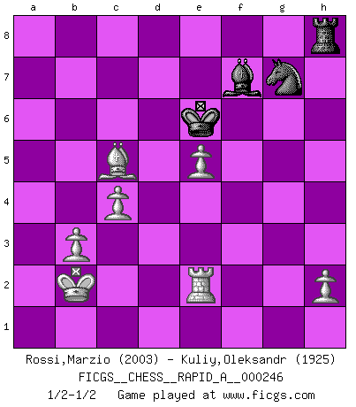 Last move : 1/2-1/2 2019 December 21 12:33:23 [Event "FICGS__CHESS__RAPID_A__000246"] [Site "FICGS"] [Date "2019.09.19"] [Round "1"] [White "Rossi,Marzio"] [Black "Kuliy,Oleksandr"] [Result "1/2-1/2"] [WhiteElo "2003"] [BlackElo "1925"] 1.e4 e6 2.d4 d5 3.Nc3 Nf6 4.e5 Nfd7 5.Qh5 c5 6.Nf3 g6 7.Qg4 Nc6 8.Bg5 Qb6 9.O-O-O Nxd4 10.Nxd4 cxd4 11.Nb5 h6 12.Qh4 a6 13.Nd6 Bxd6 14.exd6 Qxd6 15.Rxd4 e5 16.Rd2 b5 17.g4 Bb7 18.Bg2 f6 19.Be3 Rc8 20.Rhd1 Qc7 21.g5 fxg5 22.Bxg5 Kf7 23.Be3 d4 24.f4 Bxg2 25.fxe5 Bd5 26.Bxd4 Be6 27.Rf1 Ke8 28.Rf6 Qc6 29.Rxg6 Rf8 30.b3 Rf1+ 31.Kb2 Rf7 32.Qxh6 Nf8 33.Rf6 b4 34.a3 bxa3+ 35.Kxa3 a5 36.Rxf7 Bxf7 37.Qxc6 Rxc6 38.Ka4 Ra6 39.Kb5 Ra8 40.Bb6 Nd7 41.Bxa5 Rb8+ 42.Ka4 Ra8 43.Re2 Nc5+ 44.Kb4 Ke7 45.Bb6 Na6+ 46.Kc3 Rc8+ 47.Kb2 Nc5 48.Ba7 Ne6 49.Bf2 Rh8 50.c4 Ng7 51.Bc5+ Ke6 1/2-1/2 French : Steinitz variation Queenside Castling by player White (move 9) This chess game ended in a draw. Follow this game move after move (download)My God, Bobby Fischer plays so simply. (Alexei Suetin) Ich verachte Kasparow. (Viktor Kortschnoi) Fischer deseaba darle a los Rusos una sopa de su propia medicina. (Larry Evans) Le génie consiste à savoir transgresser les règles au moment opportun. (Teichmann) Lottery : A tax on people who are bad at math. (Author unknown)