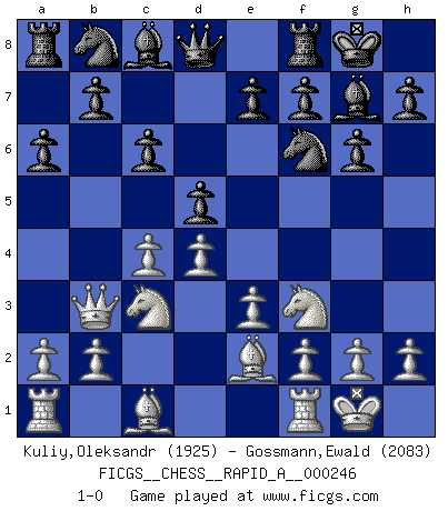 Last move : 1-0 2019 November 2 4:14:5 [Event "FICGS__CHESS__RAPID_A__000246"] [Site "FICGS"] [Date "2019.09.19"] [Round "1"] [White "Kuliy,Oleksandr"] [Black "Gossmann,Ewald"] [Result "1-0"] [WhiteElo "1925"] [BlackElo "2083"] 1.d4 d5 2.c4 c6 3.Nc3 Nf6 4.e3 g6 5.Nf3 Bg7 6.Be2 O-O 7.O-O a6 8.Qb3 1-0 This chess game has been lost on time (started : 2019.09.19 23:43:24) QGD Slav defense Kingside Castling by player Black (move 6) Kingside Castling by player White (move 7) Player White won this chess game. Follow this game move after move (download)The tactician knows what to do when there is something to do; whereas the strategian knows what to do when there is nothing to do. (Gerald Abrahams) Der Bart als Geschlechtszeichen mitten im Gesicht ist obszön. Daher gefällt er den Weibern. [Zugegeben, kein Schachzitat, aber unglaublich originell] (Arthur Schopenhauer) Cuando tu no sabes absolutamente que mas hacer, es tiempo de entrar en pánico. (John van der Wiel) Même un GMI sait rarement calculer sur plus de cinq coups une attaque à sacrifices. (Rudolf Spielmann) Heh, heh, heh. Time to abandon ship. (General Grievous in Star Wars ep.3)