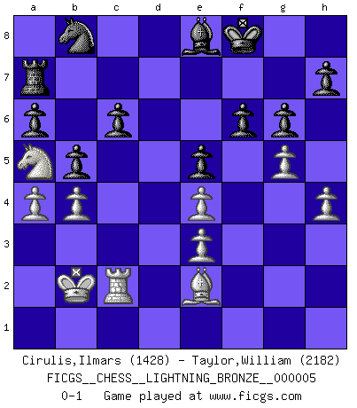 Last move : 0-1 2007 June 24 22:42:7 [Event "FICGS__CHESS__LIGHTNING_BRONZE__000005"] [Site "FICGS"] [Date "2007.06.24"] [Round "1"] [White "Cirulis,Ilmars"] [Black "Taylor,William"] [Result "0-1"] [WhiteElo "1428"] [BlackElo "2182"] 1.c4 Nf6 2.Nf3 g6 3.Nc3 Bg7 4.d4 O-O 5.e4 d6 6.Be2 e5 7.dxe5 dxe5 8.Qxd8 Rxd8 9.Bg5 Re8 10.Nd5 Nxd5 11.cxd5 c6 12.d6 f6 13.Be3 Bf8 14.O-O-O Rd8 15.Nd2 Kf7 16.Nc4 b5 17.Na5 Bxd6 18.b4 Bc7 19.Kb2 Rxd1 20.Rxd1 Bb6 21.g4 Bxe3 22.fxe3 Ke7 23.h4 Bd7 24.Rc1 a6 25.g5 Ra7 26.a4 Be8 27.Rc2 Kf8 0-1 English Opening Kingside Castling by player Black (move 4) Queenside Castling by player White (move 14) Player Black won this chess game. Follow this game move after move (download)A chess genius has died; a loss for humanity. (Viktor Kortchnoi, about Bobby Fischer's death) Die Elozahlen sind sehr schlecht für das Schach. Jetzt ist Schach eine Sportindustrie, die darauf zielt Elopunkte zu machen. (Miguel Najdorf) Yo tuve un dolor de muelas en la primer partida. En el segundo juego, tuve un dolor de cabeza. En el tercero, tuve un ataque de reumatísmo. En la cuarta partida, no me sentía muy bien. ¿Y en el quinto juego? Bueno, ¿que acaso uno tiene que ganar todos los juegos?. (Siegbert Tarrasch) Les échecs sont utiles à l'exercice de la faculté de penser et à celle de l'imagination. Car nous devons posséder une méthode élaborée pour atteindre des buts partout où nous devons conduire notre raison. (Leibnitz) Any activity becomes creative when the doer cares about doing it right or doing it better. (John Updike)