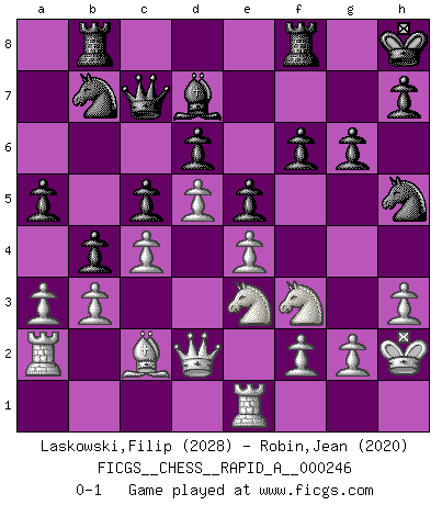 Last move : 0-1 2019 November 26 23:27:21 [Event "FICGS__CHESS__RAPID_A__000246"] [Site "FICGS"] [Date "2019.09.19"] [Round "1"] [White "Laskowski,Filip"] [Black "Robin,Jean"] [Result "0-1"] [WhiteElo "2028"] [BlackElo "2020"] 1.e4 e5 2.Nf3 Nc6 3.Bb5 a6 4.Ba4 Nf6 5.O-O Be7 6.Re1 b5 7.Bb3 O-O 8.c3 d6 9.h3 Na5 10.Bc2 c5 11.d4 Qc7 12.d5 Bd7 13.b3 g6 14.Bh6 Rfe8 15.Nbd2 Nh5 16.Nf1 Bf8 17.Qd2 Nb7 18.Bxf8 Rxf8 19.c4 f6 20.Ne3 b4 21.Kh2 a5 22.a3 Kh8 23.Ra2 Rab8 0-1 Ruy Lopez : Closed, 7...O-O Kingside Castling by player White (move 5) Kingside Castling by player Black (move 7) Player Black won this chess game. Follow this game move after move (download)By this measure (on the gap between Fischer & his contemporaries), I consider him the greatest world champion. (Garry Kasparov) Wer mein Gambit spielt, muß bereit sein, alle Brücken hinter sich abzubrechen. Es verändert den ganzen Menschen. Es wirkt wie ein Zauberstab und fördert verkümmerte, gute Charakter- eigenschaften wieder zu Tage. (Emil Joseph Diemer) Nunca antes ha habido un jugador de Ajedrez con tal conocimiento a fondo de las complejidades del juego y una inmensa voluntad absolutamente indomable de ganar. Yo pienso que Fischer es el jugador mas grande que jamás haya existido. (Lisa Lane) Il vaut mieux sacrifier les pièces de l'adversaire. (Xavier Tartacover) The obstacle is the path. (Zen proverb)