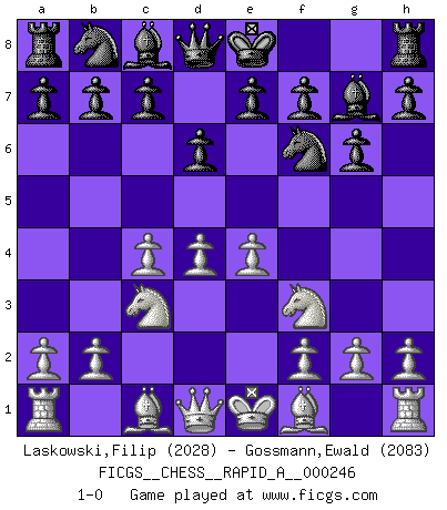 Last move : 1-0 2019 November 2 4:14:5 [Event "FICGS__CHESS__RAPID_A__000246"] [Site "FICGS"] [Date "2019.09.19"] [Round "1"] [White "Laskowski,Filip"] [Black "Gossmann,Ewald"] [Result "1-0"] [WhiteElo "2028"] [BlackElo "2083"] 1.d4 Nf6 2.c4 g6 3.Nc3 Bg7 4.e4 d6 5.Nf3 1-0 This chess game has been lost on time (started : 2019.09.19 23:43:24) King's Indian : 5.Nf3 Player White won this chess game. Follow this game move after move (download)You can only get good at Chess if you love the game. (Bobby Fischer) Man braucht nicht immer den besten Zug zu spielen: Ein Zug muß aktiv, unternehmungslustig, korrekt und schön sein. (David Bronstein) Robert Fischer es la ley hacia si mismo. (Larry Evans) Les échecs sont un jeu terrible. Si vous n'avez pas le centre, votre adversaire a une position plus libre. Par contre, si vous avez le centre, alors vous avez vraiment quelque chose pour laquelle vous inquiéter ! (Siegbert Tarrasch) There is far too much law for those who can afford it and far too little for those who cannot. (Derek Bok)