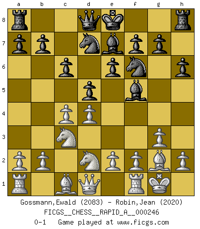 Last move : 0-1 2019 November 2 4:14:5 [Event "FICGS__CHESS__RAPID_A__000246"] [Site "FICGS"] [Date "2019.09.19"] [Round "1"] [White "Gossmann,Ewald"] [Black "Robin,Jean"] [Result "0-1"] [WhiteElo "2083"] [BlackElo "2020"] 1.Nf3 Nf6 2.g3 d5 3.d4 Bf5 4.Bg2 h6 5.O-O c6 6.c4 e6 7.Nc3 Be7 8.Nd2 Nbd7 0-1 This chess game has been lost on time (started : 2019.09.19 23:43:24) Reti Opening Kingside Castling by player White (move 5) Player Black won this chess game. Follow this game move after move (download)Chess is life. (Bobby Fischer) Ein Kibitz ist einer, der deinem Gegner gute Ratschläge gibt. (Andrew Soltis) El Ajedrez era la lengua materna de Capablanca. (Reti) Si je n'étais pas joueur d'échecs, je serais le meilleur dans quelque chose d'autre. (Anatoli Karpov) The Internet is so big, so powerful and pointless that for some people it is a complete substitute for life. (Andrew Brown)