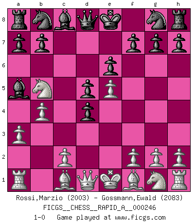 Last move : 1-0 2019 November 4 10:35:5 [Event "FICGS__CHESS__RAPID_A__000246"] [Site "FICGS"] [Date "2019.09.19"] [Round "1"] [White "Rossi,Marzio"] [Black "Gossmann,Ewald"] [Result "1-0"] [WhiteElo "2003"] [BlackElo "2083"] 1.e4 e6 2.d4 d5 3.Nc3 Bb4 4.e5 c5 5.a3 Ba5 6.b4 cxd4 7.Nb5 1-0 This chess game has been lost on time (started : 2019.09.19 23:43:24) French : Winawer, Advance, 5.a3 Player White won this chess game. Follow this game move after move (download)Excellence at Chess is one mark of a scheming mind. (Sir Arthur Conan Doyle) Ich würde mich als ganz normalen Jungen bezeichnen [Im Alter von 12]. (Sergej Karjakin) Si un gobernante no entiende al Ajedrez, ¿como puede governar él un reinado?. (El Rey Khusros II) Tous ces prétendus hommes politiques sont les pions, les Cavaliers, les Tours ou les Fous d'une partie d'échecs qui se jouera tant qu'un hasard ne renversera pas l'échiquier. (Honoré de Balzac) No man has ever achieved immortality in his own life time. (Unknown)