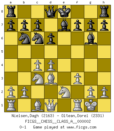 Last move : 0-1 2006 August 1 3:19:25 [Event "FICGS__CHESS__CLASS_A__000002"] [Site "FICGS"] [Date "2006.04.10"] [Round "1"] [White "Nielsen,Dagh"] [Black "Oltean,Dorel"] [Result "0-1"] [WhiteElo "2163"] [BlackElo "2331"] 1.e4 Nf6 2.e5 Nd5 3.c4 Nb6 4.d4 d6 5.exd6 exd6 6.Nc3 Be7 7.Bd3 Nc6 8.Nge2 Bg4 9.f3 Bh5 10.O-O Bg6 0-1 This chess game has been lost on time (started : 2006.04.10 15:33:23) Alekhine's defense Kingside Castling by player White (move 10) Player Black won this chess game. Follow this game move after move (download)Play the opening like a book, the middle game like a magician, and the endgame like a machine. (Spielmann) Schach ist ein schwarz-weisser Dschungel. (Garry Kasparov) ¿Cual es el objetivo de jugar una apertura de gambito?... Para adquirir una reputación de ser un jugador apuesto a costo de perder el juego. (Siegbert Tarrasch) Il a essayé de se convaincre qu'il pourrait empêcher toutes les erreurs et ne jamais perdre. L'horreur ! Gary Kasparov au sujet de Robert Fischer. The problem with manipulation is that people can turn on you. (Horatio Caine, C.S.I. Miami)