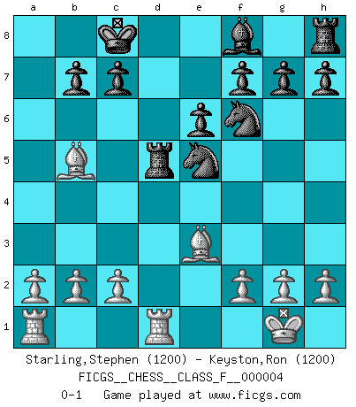 Last move : 0-1 2006 September 5 11:29:53 [Event "FICGS__CHESS__CLASS_F__000004"] [Site "FICGS"] [Date "2006.06.18"] [Round "1"] [White "Starling,Stephen"] [Black "Keyston,Ron"] [Result "0-1"] [WhiteElo "1200"] [BlackElo "1200"] 1.e4 d5 2.exd5 Qxd5 3.Nc3 Qd6 4.Nf3 Nf6 5.d4 a6 6.Bc4 Nc6 7.O-O Bg4 8.Be3 O-O-O 9.d5 Qb4 10.Qe2 Ne5 11.Bxa6 Bxf3 12.Qb5 Qxb5 13.Bxb5 Bxd5 14.Rfd1 e6 15.Nxd5 Rxd5 0-1 Scandinavian : Pytel-Wade variation Kingside Castling by player White (move 7) Queenside Castling by player Black (move 8) Player Black won this chess game. Follow this game move after move (download)Chess makes man wiser and clear-sighted. (Vladimir Putin) Es ist peinlich, dass ich nie Weltmeister wurde. Es wäre leicht, Leonid Breschnjew als Ursache vorzuschieben, dessen Apparat den Vorzeigekommunisten Anatoli Karpow in allem unterstützte. Aber Garri Kasparow zum Beispiel, der ebenfalls von den Sowjets unerwünscht war, hat trotz der Widerstände den WM-Titel erobert. (Viktor Kortschnoi) Si el ingenio solamente fuese necesario para lucirse, las mujeres serían las mejores jugadoras de Ajedrez del mundo. (Albin) La victoire dans une partie d'Echecs appartient la plupart du temps à celui qui voit un peu plus loin que l'adversaire. (Lasker) Luck never made a man wise. (Seneca, Letters to Lucilius)