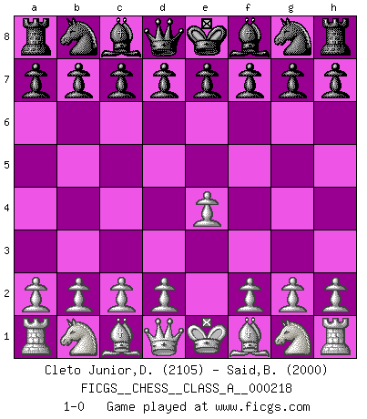 Last move : 1-0 2019 October 30 19:19:17 [Event "FICGS__CHESS__CLASS_A__000218"] [Site "FICGS"] [Date "2019.09.20"] [Round "1"] [White "Cleto Junior,Dirceu"] [Black "Said,Boussaha"] [Result "1-0"] [WhiteElo "2105"] [BlackElo "2000"] 1.e4 1-0 This chess game has been lost on time (started : 2019.09.20 12:59:27) King's pawn Opening Player White won this chess game. Follow this game move after move (download)You know you're going to lose. Even when I was ahead I knew I was going to lose. - On playing against Fischer. (Andrew Soltis) In Buenos Aires ist es nicht mein vorrangiges Ziel ein starkes Turnier zu organisieren, sondern ein Turnier für Gentlemen. Ich würde nie Kamsky einladen. Ich mag keine Probleme. (Miguel Najdorf) Una victoria por una combinación errónea, aunque sea espectacular, me llena de horror artístico. (Wilhelm Steinitz) Les échecs sont un jeu terrible. Si vous n'avez pas le centre, votre adversaire a une position plus libre. Par contre, si vous avez le centre, alors vous avez vraiment quelque chose pour laquelle vous inquiéter ! (Siegbert Tarrasch) In theory there is no difference between theory and practice. In practice there is. (Yogi Berra)