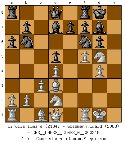 Last move : 1-0 2019 November 26 23:42:23 [Event "FICGS__CHESS__CLASS_A__000218"] [Site "FICGS"] [Date "2019.09.20"] [Round "1"] [White "Cirulis,Ilmars"] [Black "Gossmann,Ewald"] [Result "1-0"] [WhiteElo "2134"] [BlackElo "2083"] 1.f4 d5 2.Nf3 Nf6 3.e3 c5 4.c3 g6 5.d4 Bg7 6.Nbd2 Bf5 7.h3 h5 8.Be2 Nbd7 9.O-O O-O 10.Ng5 cxd4 11.exd4 Nb6 12.g4 hxg4 13.hxg4 Bd7 14.f5 a6 15.Bd3 1-0 Bird's Opening : Lasker variation Kingside Castling by player White (move 9) Kingside Castling by player Black (move 9) Player White won this chess game. Follow this game move after move (download)The combination player thinks forward; he starts from the given position, and tries the forceful moves in his mind. (Emanuel Lasker) In der Schule lernt man nichts. Es ist nur Zeitverschwendung. (Robert James Fischer) Combinaciones deslumbrantes son para la mayoría, mover madera es para los pocos. (Georg Kieninger) L'attaque fait le spectacle, la défense gagne les matchs. (Dicton footballistique) Luck never gives; it only lends. (Swedish proverb)