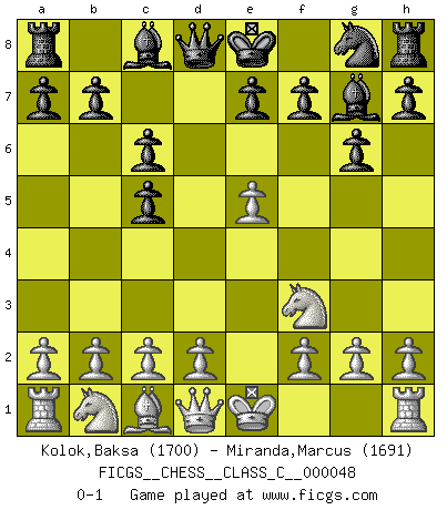 Last move : 0-1 2007 August 12 3:19:15 [Event "FICGS__CHESS__CLASS_C__000048"] [Site "FICGS"] [Date "2007.06.26"] [Round "1"] [White "Kolok,Baksa"] [Black "Miranda,Marcus"] [Result "0-1"] [WhiteElo "1700"] [BlackElo "1691"] 1.e4 c5 2.e5 Nc6 3.Nf3 g6 4.Bb5 Bg7 5.Bxc6 dxc6 0-1 This chess game has been lost on time (started : 2007.06.26 12:55:44) Sicilian defense Player Black won this chess game. Follow this game move after move (download)I played Chess with him and would have beaten him sometimes only he always took back his last move, and ran the game out differently. (Mark Twain) Im Schach nämlich geht es darum, daß Ich des Gegners klein zu kriegen, sein Ego zu zerbrechen und zu zermahlen, seine Selbstachtung zu zertreten und zu verscharren und seine ganze mißachtenswerte sogenannte Persönlichkeit ein für alle Mal tot zu hacken und zu zerstampfen und dadurch die menschliche Gesellschaft von einer stinkenden Pestbeule zu befreien. Es ist ein königliches Spiel. (Robert James Fischer) Por tratar de evitar la pérdida de una pieza, muchas personas han perdido una partida de Ajedrez. (Savielly Tartakover) Le thème de l'attaque double intervient d'une manière ou d'une autre dans l'immense majorité des combinaisons. (Youri Averbakh) Unless in communicating with it one says exactly what one means, trouble is bound to result. (Alan Turing, about computers)