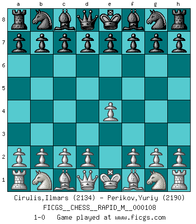 Last move : 1-0 2019 September 21 17:5:59 [Event "FICGS__CHESS__RAPID_M__000108"] [Site "FICGS"] [Date "2019.09.20"] [Round "1"] [White "Cirulis,Ilmars"] [Black "Perikov,Yuriy"] [Result "1-0"] [WhiteElo "2134"] [BlackElo "2190"] 1.e4 1-0 King's pawn Opening Player White won this chess game. Follow this game move after move (download)Chess demands total concentration. (Bobby Fischer) Als ich elf wurde, wurde ich einfach gut. (Robert James Fischer) Ciertamente el estado mental actual de Bobby Fischer es una tragedia. Uno de los mas grandes jugadores de Ajedrez del mundo -el orgullo y pena del Ajedrez Americano. (Frank Brady) Les échecs, c'est la lutte contre l'erreur. (Johannes Zukertort) A shortcut is the longest distance between two points. (Don Groves)