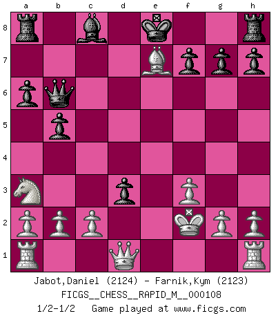 Last move : 1/2-1/2 2019 November 14 17:32:59 [Event "FICGS__CHESS__RAPID_M__000108"] [Site "FICGS"] [Date "2019.09.20"] [Round "1"] [White "Jabot,Daniel"] [Black "Farnik,Kym"] [Result "1/2-1/2"] [WhiteElo "2124"] [BlackElo "2123"] 1.e4 c5 2.Nf3 Nc6 3.d4 cxd4 4.Nxd4 Nf6 5.Nc3 e5 6.Ndb5 d6 7.Bg5 a6 8.Na3 b5 9.Nd5 Be7 10.Nxe7 Nxe7 11.Bd3 d5 12.exd5 Qxd5 13.f3 e4 14.Bxf6 exd3 15.Bxe7 Qe6+ 16.Kf2 Qb6+ 17.Kg3 Qc7+ 18.Kf2 Qb6+ 1/2-1/2 Sicilian : Pelikan (Lasker/Sveshnikov) variation This chess game ended in a draw. Follow this game move after move (download)There are two classes of men; those who are content to yield to circumstances and who play whist; those who aim to control circumstances, and who play Chess. (Mortimer Collins) Ein bischen Romantik kann weder im Schach noch in der Liebe schaden. Also versuche ich mich ab und zu daran zu erinnern. (Nigel Short) Aquellos que dicen que entienden al Ajedrez, no entienden nada. (Robert Hubner) Les sacrifices démontrent seulement que quelqu'un a gaffé. (Savielly Tartacover) It's unlucky to be superstitious. (Dave Enteles)