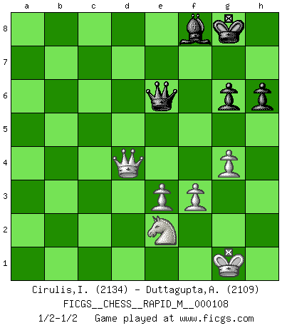 Last move : 1/2-1/2 2020 January 3 12:4:11 [Event "FICGS__CHESS__RAPID_M__000108"] [Site "FICGS"] [Date "2019.09.20"] [Round "1"] [White "Cirulis,Ilmars"] [Black "Duttagupta,Aniruddha"] [Result "1/2-1/2"] [WhiteElo "2134"] [BlackElo "2109"] 1.b4 e5 2.a3 d5 3.Bb2 Nd7 4.e3 a5 5.b5 Ngf6 6.c4 Bd6 7.cxd5 Nxd5 8.Qc2 O-O 9.Nf3 Qe7 10.Be2 Re8 11.d3 N7b6 12.Nbd2 Bd7 13.d4 exd4 14.Nxd4 Qg5 15.N4f3 Qh6 16.Bd4 c5 17.bxc6 bxc6 18.Bxb6 Nxb6 19.O-O Nd5 20.Nc4 Bc7 21.Rfd1 Rad8 22.Rac1 Qe6 23.Nd4 Qf6 24.Bf3 h6 25.Nd2 Qe5 26.Nf1 Ne7 27.Nxc6 Bxc6 28.Bxc6 Nxc6 29.Rxd8 Rxd8 30.Qxc6 Bd6 31.Rd1 Qe7 32.Rd5 a4 33.h4 Bxa3 34.Rxd8+ Qxd8 35.Qxa4 Bf8 36.h5 Qd5 37.g4 g6 38.Ng3 Kg7 39.hxg6 fxg6 40.Ne2 Qe6 41.Qd4+ Kg8 42.f3 1/2-1/2 Polish (Sokolsky) opening Kingside Castling by player Black (move 8) Kingside Castling by player White (move 19) This chess game ended in a draw. Follow this game move after move (download)The tactician must know what to do whenever something needs doing; the strategist must know what to do when nothing needs doing. (Savielly Tartakover) Dein Körper muss in Topform sein. Dein Schach verfällt, wenn dein Körper verfällt. Der Körper kann nicht vom Geist getrennt werden. (Robert James Fischer) Botvinnik trató de alejar el misterio referente al Ajedrez, siempre relacionandolo a situaciones de la vida diaria. Solía llamar al Ajedrez un problema inexacto típico, similar a aquellos en que la gente tiene siempre que resolver a cada día. (Garry Kasparov) Plusieurs personnes se sont demandées comment Tal faisait pour gagner... En fait, c'est très simple ! Il met ses pièces au centre de l'échiquier et les sacrifie quelque part ! (David Bronstein) The existence of forgetting has never been proved: We only know that some things don't come to mind when we want them. (Friedrich Nietzsche)