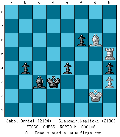 Last move : 1-0 2019 December 9 23:18:9 [Event "FICGS__CHESS__RAPID_M__000108"] [Site "FICGS"] [Date "2019.09.20"] [Round "1"] [White "Jabot,Daniel"] [Black "Slawomir,Weglicki"] [Result "1-0"] [WhiteElo "2124"] [BlackElo "2130"] 1.e4 c5 2.Nf3 d6 3.d4 cxd4 4.Nxd4 Nf6 5.Nc3 a6 6.Bg5 e6 7.f4 h6 8.Bh4 Qb6 9.Bxf6 gxf6 10.Qd2 Qxb2 11.Nb3 Qa3 12.Be2 h5 13.O-O Nd7 14.Kh1 h4 15.h3 Be7 16.Rad1 b5 17.Nb1 Qb2 18.Qe3 Qxc2 19.Nc3 b4 20.Rc1 Qb2 21.Na4 Qa3 22.Nb6 Nxb6 23.Qxb6 Bd7 24.f5 Rd8 25.fxe6 fxe6 26.Rc7 Qxa2 27.Nd4 Rg8 28.e5 Rxg2 29.Kxg2 dxe5 30.Kg1 exd4 31.Bh5+ Kf8 32.Qxd4 e5 33.Qe3 Qg8+ 34.Kh1 Qg3 35.Qh6+ Qg7 36.Qxg7+ Kxg7 37.Rd1 Kh6 38.Rcxd7 Rxd7 39.Rxd7 Bc5 40.Bf7 Kg5 41.Kg2 Kf4 42.Rc7 Bd4 43.Rc6 e4 44.Rxa6 Ke3 45.Ra5 Kd3 46.Bg6 Bc3 47.Rh5 1-0 Sicilian : Najdorf, 7.f4 Kingside Castling by player White (move 13) 10 pieces endgame at move 44 : White KRBP , Black KBPPPP WHITE : King + 1 Rook 1 Bishop 1 Pawn BLACK : King + 1 Bishop 4 Pawns Player White won this chess game. Follow this game move after move (download)Though most people love to look at the games of the great attacking masters, some of the most successful players in history have been the quiet positional players. They slowly grind you down by taking away your space, tying up your pieces, and leaving you with virtually nothing to do ! (Yasser Seirawan) Sitze auf Deine Hände. (Siegbert Tarrasch) El Ajedrez es un invernadero donde los frutos del carácter pueden madurar mas completamente que en la vida. (Edward Morgan Foster) Les échecs sont un jeu terrible. Si vous n'avez pas le centre, votre adversaire a une position plus libre. Par contre, si vous avez le centre, alors vous avez vraiment quelque chose pour laquelle vous inquiéter ! (Siegbert Tarrasch) God is an atheist. (Unknown)