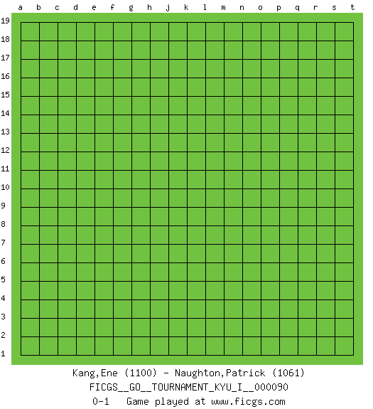 Last move : 0-1 2019 October 23 1:42:25 [Event "FICGS__GO__TOURNAMENT_KYU_I__000090"] [Site "FICGS"] [Date "2019.09.22"] [Round "1"] [Black "Kang,Ene"] [White "Naughton,Patrick"] [Result "0-1"] [Rating 1 "1100"] [Rating 2 "1061"] 0-1 This go game has been lost on time (started : 2019.09.22 17:48:17) Here are the names of the openings (joseki) played in the four corners : Player White won this Go (weiqi, baduk) game. Follow this game move after move (download)Very few good moves are played. (Pierre Audouard) Begin at the beginning and go on till you come to the end; then stop. (Lewis Carrol, Alice in Wonderland)