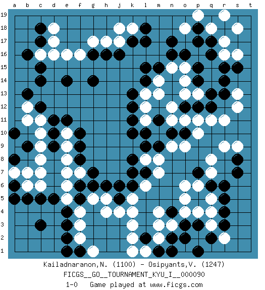 Last move : 1-0 2019 October 2 19:53:51 [Event "FICGS__GO__TOURNAMENT_KYU_I__000090"] [Site "FICGS"] [Date "2019.09.22"] [Round "1"] [Black "Kailadnaranon,Nanthwat"] [White "Osipyants,Vladimir"] [Result "1-0"] [Rating 1 "1100"] [Rating 2 "1247"] 1.q16 q4 2.c3 c16 3.k10 e16 4.d11 c6 5.e4 c9 6.o3 m4 7.r6 o4 8.r3 q3 9.r4 q5 10.r5 r11 11.r14 q8 12.p7 q7 13.q6 p6 14.q2 p2 15.p5 o6 16.p3 p4 17.n4 o5 18.o2 n3 19.n2 m3 20.k17 h17 21.n17 l8 22.c14 c11 23.d10 c10 24.c17 d17 25.e14 h4 26.h16 g17 27.g16 f16 28.g14 m10 29.k8 e8 30.l9 m8 31.f9 e9 32.f10 m13 33.k13 r17 34.q17 r16 35.r15 q18 36.p18 s18 37.q19 r19 38.r18 r2 39.p1 q18 40.b16 p19 41.c18 d18 42.c15 j17 43.j16 k18 44.l17 f3 45.e3 f4 46.l2 k3 47.q12 q11 48.p12 p11 49.o12 n11 50.c12 b12 51.b13 b11 52.b5 b6 53.k7 l6 54.f8 m2 55.m1 k2 56.s8 r9 57.m11 n12 58.m9 n9 59.o10 o11 60.n10 o9 61.l10 p10 62.l14 o13 63.p14 p13 64.q13 o14 65.p15 o15 66.o16 s9 67.s15 s16 68.l18 j18 69.s7 s13 70.c5 o18 71.p17 e5 72.d5 e6 73.a6 a7 74.a5 c7 75.l7 m7 76.e2 f2 77.f1 g1 78.e1 k1 79.n1 l1 80.k6 k5 81.j5 k4 82.g6 g5 83.h6 j4 84.f6 e7 85.f5 h5 86.j6 e10 87.e11 l12 88.k12 m14 89.m15 l11 90.k11 n15 91.n16 l13 92.l15 f7 93.g7 d16 94.r13 s12 95.d9 c8 96.a8 b7 97.a10 a9 98.b9 1-0 Here are the names of the openings (joseki) played in the four corners : Corner d4 : c3 c6 San-San (Sam-Sam, San-San) 3-3 Point. The San-San (3-3) point, emphasizing territory at the expense of influence. Niken Kakari (Dukan Keolch'im, E`r Gua`jiao~, 2-Space Low Approach). Black can thwart White's strategy with a play at 9-4. Corner q4 : q4 o3 Hoshi (Hwajeom, Seongjeom, Xingwei`) 4-4 Point. The star or hoshi (4-4) point, emphasizing influence at the potential expense of territory. Ikken Kakari (Hankan Keolch'im, Yi Gua`jiao~, 1-Space Low Approach). Black 2 is the standard approach move to the 4-4. Corner q16 : q16 r11 Hoshi (Hwajeom, Seongjeom, Xingwei`) 4-4 Point. The star or hoshi (4-4) point, emphasizing influence at the potential expense of territory. Player Black won this Go (weiqi, baduk) game. Follow this game move after move (download)If you don't know ladders, don't play go. (Anonymous) Is not life a hundred times too short to bore ourselves ? (Friedrich Nietzsche)