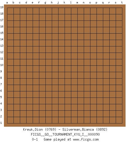 Last move : 0-1 2019 October 23 1:42:25 [Event "FICGS__GO__TOURNAMENT_KYU_I__000090"] [Site "FICGS"] [Date "2019.09.22"] [Round "1"] [Black "Kreuk,Dion"] [White "Silverman,Bianca"] [Result "0-1"] [Rating 1 "0769"] [Rating 2 "0892"] 0-1 This go game has been lost on time (started : 2019.09.22 17:48:17) Here are the names of the openings (joseki) played in the four corners : Player White won this Go (weiqi, baduk) game. Follow this game move after move (download)If a formation is symmetrical, play at the center. (Anonymous) The mind is like a parachute, it only functions when its open. (Unknown)