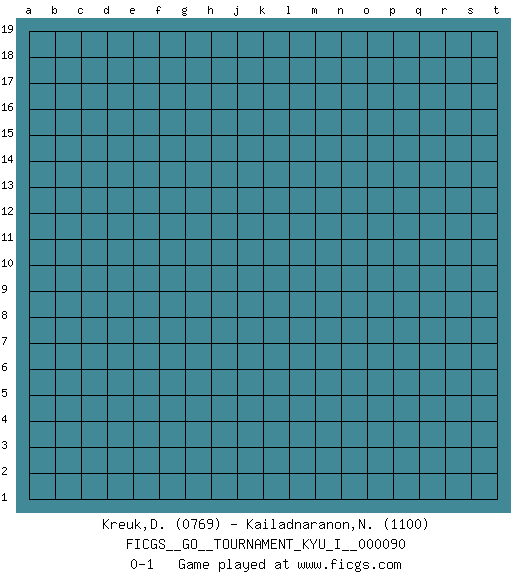 Last move : 0-1 2019 October 23 1:42:25 [Event "FICGS__GO__TOURNAMENT_KYU_I__000090"] [Site "FICGS"] [Date "2019.09.22"] [Round "1"] [Black "Kreuk,Dion"] [White "Kailadnaranon,Nanthwat"] [Result "0-1"] [Rating 1 "0769"] [Rating 2 "1100"] 0-1 This go game has been lost on time (started : 2019.09.22 17:48:17) Here are the names of the openings (joseki) played in the four corners : Player White won this Go (weiqi, baduk) game. Follow this game move after move (download)Nothing requires doing this or that, but necessity exists. (Pierre Audouard) To err is human, to shift the blame on someone else is tactical. (Mladen Jankovic)