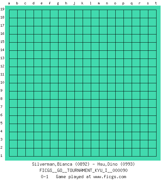 Last move : 0-1 2019 October 23 1:42:25 [Event "FICGS__GO__TOURNAMENT_KYU_I__000090"] [Site "FICGS"] [Date "2019.09.22"] [Round "1"] [Black "Silverman,Bianca"] [White "Hsu,Dino"] [Result "0-1"] [Rating 1 "0892"] [Rating 2 "0993"] 0-1 This go game has been lost on time (started : 2019.09.22 17:48:17) Here are the names of the openings (joseki) played in the four corners : Player White won this Go (weiqi, baduk) game. Follow this game move after move (download)Beginner's games are surprising, often incoherent and incomprehensible. When you improve, your game gains in consistency but flirts with stupidity: you become satisfied with truisms and mechanical movements, you try to obtain a feeling for clearness and style the easy way. (Pierre Audouard) I've lost money so fast in these clubs it's left me reeling. I've read every poker book ever written, but the only way to get better at the game is to go out and play with people who are really good. The problem is, you stand to lose a lot of money doing it. (Matt Damon)