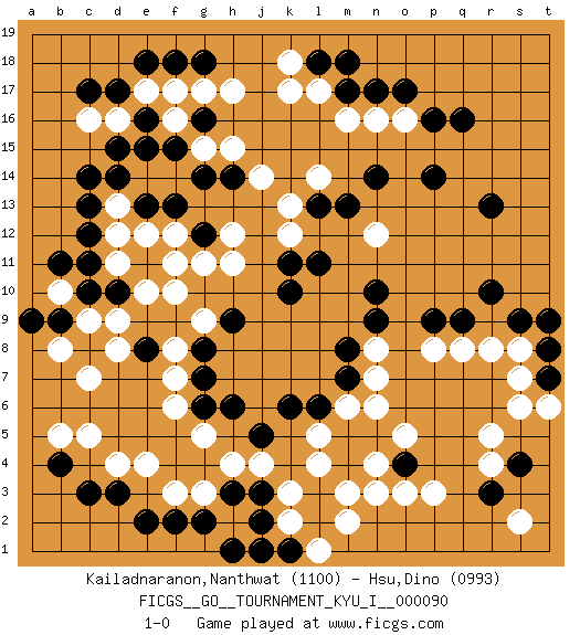 Last move : 1-0 2019 November 5 3:53:55 [Event "FICGS__GO__TOURNAMENT_KYU_I__000090"] [Site "FICGS"] [Date "2019.09.22"] [Round "1"] [Black "Kailadnaranon,Nanthwat"] [White "Hsu,Dino"] [Result "1-0"] [Rating 1 "1100"] [Rating 2 "0993"] 1.q16 d16 2.c3 r4 3.k10 p3 4.r10 d4 5.d3 e4 6.f2 h4 7.c17 c16 8.d17 e17 9.e18 f17 10.f18 g17 11.g18 h17 12.o17 b5 13.b4 c5 14.d10 f10 15.c13 d12 16.c12 d11 17.c11 c9 18.c10 d13 19.d14 e14 20.e11 f12 21.e15 f14 22.c14 e10 23.e16 r8 24.r13 n16 25.d15 o16 26.p16 n12 27.n17 m16 28.n10 k12 29.m17 l17 30.n14 l14 31.p14 n8 32.o4 o3 33.m4 n4 34.n5 n3 35.s4 r5 36.r3 s2 37.m8 n7 38.n9 n6 39.m5 o5 40.m13 m6 41.l6 l5 42.k6 l4 43.m7 m3 44.l11 d9 45.g6 h2 46.e8 f7 47.b9 b8 48.c8 b10 49.a9 d8 50.b11 c7 51.g7 f8 52.h9 h11 53.g16 f16 54.f15 g15 55.g14 h15 56.f13 e12 57.g12 g11 58.e13 f11 59.p9 p8 60.q9 q8 61.s9 s8 62.t8 s7 63.t7 t6 64.t9 s6 65.l18 k17 66.l13 k13 67.k11 h12 68.h14 j14 69.j5 f3 70.g2 g3 71.e2 f6 72.j3 j4 73.j2 k3 74.h3 k2 75.h1 k18 76.k1 l1 77.j1 m2 78.m18 g5 79.g8 g9 80.h6 1-0 Here are the names of the openings (joseki) played in the four corners : Corner d4 : c3 d4 San-San (Sam-Sam, San-San) 3-3 Point. The San-San (3-3) point, emphasizing territory at the expense of influence. Kata-tsuki (shoulder hit). The shoulder-hit is the traditional answer to the 3-3. The direction of Black 3 depends on the positions on the side. Crawling once may be the premise for a follow-up move of sliding with a knight's move in the opposite direction. If Black plays 3 at 3-4 (to the right), the follow-on knight's move is then played at the top (e.g. 3-4, 4-5, 5-2). Black's knight's move reduces territory potential on the side it is played. Corner d16 : d16 c17 Hoshi (Hwajeom, Seongjeom, Xingwei`) 4-4 Point. The star or hoshi (4-4) point, emphasizing influence at the potential expense of territory. Player Black won this Go (weiqi, baduk) game. Follow this game move after move (download)It is difficult to know exactly what you are doing. (Pierre Audouard) Whenever people agree with me, I always feel I must be wrong. (Oscar Wilde)