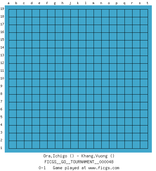 Last move : 0-1 2019 October 24 17:9:1 [Event "FICGS__GO__TOURNAMENT__000048"] [Site "FICGS"] [Date "2019.09.24"] [Round "1"] [Black "Ora,Ichigo"] [White "Khang,Vuong"] [Result "0-1"] 0-1 This go game has been lost on time (started : 2019.09.24 9:46:38) Here are the names of the openings (joseki) played in the four corners : Player White won this Go (weiqi, baduk) game. Follow this game move after move (download)The poor player plays the opponent's game for him. (Anonymous) There are more things in heaven and earth than practically anywhere else. (Unknown)