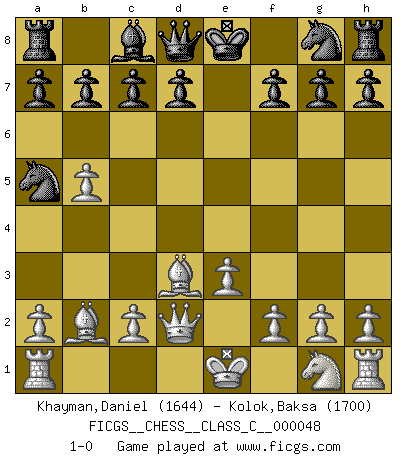 Last move : 1-0 2007 August 13 9:27:44 [Event "FICGS__CHESS__CLASS_C__000048"] [Site "FICGS"] [Date "2007.06.26"] [Round "1"] [White "Khayman,Daniel"] [Black "Kolok,Baksa"] [Result "1-0"] [WhiteElo "1644"] [BlackElo "1700"] 1.b4 e5 2.Bb2 e4 3.e3 Nc6 4.b5 Na5 5.d3 exd3 6.Bxd3 Bb4+ 7.Nd2 Bxd2+ 8.Qxd2 1-0 This chess game has been lost on time (started : 2007.06.26 12:55:44) Polish (Sokolsky) opening Player White won this chess game. Follow this game move after move (download)Chess is thirty to forty percent psychology. You don't have this when you play a computer. I can't confuse it. (Judith Polgar) Das Schachspiel ist ein See, in welchem eine Mücke baden und ein Elefant ertrinken kann. (Emanuel Lasker) El juego del Ajedrez no es solamente una diversión quieta; algunas cualidades muy valuables de la mente se pueden adquirir y cultivar con el, como convertirlos en habitos disponibles para toda ocasión; ya que la vida es algo así como el Ajedrez. (Benjamin Franklin) Les échecs sont un jeu par leur forme, un art par leur essence et une science par sa difficulté d'acquisition. Ils peuvent vous procurer autant de plaisir qu'un bon livre ou une belle musique, mais vous n'aurez une réelle joie que si vous arrivez à bien jouer. (Tigran Petrosian) Tomorrow's what you make of it. (Horatio Caine, C.S.I. Miami)