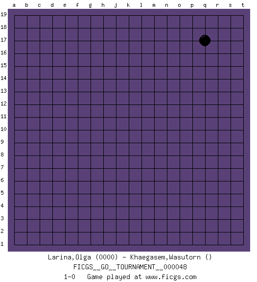 Last move : 1-0 2019 October 24 17:9:1 [Event "FICGS__GO__TOURNAMENT__000048"] [Site "FICGS"] [Date "2019.09.24"] [Round "1"] [Black "Larina,Olga"] [White "Khaegasem,Wasutorn"] [Result "1-0"] [Rating 1 "0000"] 1.q17 1-0 This go game has been lost on time (started : 2019.09.24 9:46:38) Here are the names of the openings (joseki) played in the four corners : Player Black won this Go (weiqi, baduk) game. Follow this game move after move (download)Sacrifice for shape. (Anonymous) There are two kinds of tragedy in this world, one is not getting what you want and the other is getting. (Lord of war)