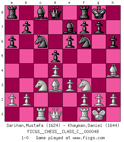 Last move : 1-0 2007 August 28 12:58:36 [Event "FICGS__CHESS__CLASS_C__000048"] [Site "FICGS"] [Date "2007.06.26"] [Round "1"] [White "Sarihan,Mustafa"] [Black "Khayman,Daniel"] [Result "1-0"] [WhiteElo "1624"] [BlackElo "1644"] 1.Nf3 Nf6 2.d4 d5 3.c4 c6 4.cxd5 cxd5 5.Nc3 e6 6.Bg5 Be7 7.Rc1 O-O 8.e3 Nc6 9.Bd3 h6 10.Bh4 a6 11.O-O 1-0 Reti Opening Kingside Castling by player Black (move 7) Kingside Castling by player White (move 11) Player White won this chess game. Follow this game move after move (download)The only thing Chess players have in common is Chess. (Lodewijk Prins) Ich hatte meine größten Erfolge, als ich 47 Jahre alt war. Kasparow war noch nicht mal 42 und hat das Schach schon im Stich gelassen. (Viktor Kortschnoi) Con o sin el título, Bobby Fischer fue sin lugar a dudas el mas grande jugador de su época. (Burt Hochberg) Le génie consiste à savoir transgresser les règles au moment opportun. (Teichmann) There is no vagueness without wind. (Chinese proverb)
