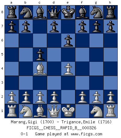 Last move : 0-1 2019 November 1 11:57:34 [Event "FICGS__CHESS__RAPID_B__000326"] [Site "FICGS"] [Date "2019.09.29"] [Round "1"] [White "Marang,Gigi"] [Black "Trigance,Emile"] [Result "0-1"] [WhiteElo "1700"] [BlackElo "1716"] 1.e4 c5 2.Bc4 e6 0-1 This chess game has been lost on time (started : 2019.09.29 11:35:40) Sicilian defense Player Black won this chess game. Follow this game move after move (download)In Chess, at least, the brave inherit the earth. (Edmar Mednis) Strategie ist, wie man ein Mädchen auf den Rücksitz bekommt. Taktik ist, was man tut, wenn man dann dort ist. (Anonymous) Una de estas pequeñas movidas modestas pudieran ser mas molestas a tu oponente que la amenaza mas grande. (Siegbert Tarrasch) Les sacrifices démontrent seulement que quelqu'un a gaffé. (Savielly Tartacover) How many people work in NATO Headquarters ? - About half of them. (Dirk Stikker, NATO general secretary)