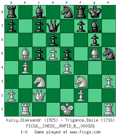 Last move : 1-0 2019 October 17 10:45:21 [Event "FICGS__CHESS__RAPID_B__000326"] [Site "FICGS"] [Date "2019.09.29"] [Round "1"] [White "Kuliy,Oleksandr"] [Black "Trigance,Emile"] [Result "1-0"] [WhiteElo "1925"] [BlackElo "1716"] 1.d4 Nf6 2.c4 g6 3.Nc3 Bg7 4.e4 d6 5.h3 O-O 6.Be3 e5 7.d5 Nbd7 8.Nf3 Nc5 9.Qc2 Ne8 10.b4 Nd7 11.Rb1 b6 12.Be2 Ndf6 13.g4 h5 14.Bg5 Qd7 15.c5 bxc5 16.gxh5 Nxh5 17.Bb5 1-0 King's Indian : Makagonov system (5.h3) Kingside Castling by player Black (move 5) Player White won this chess game. Follow this game move after move (download)It's always better to sacrifice your opponent's men. (Savielly Tartakover) Wer wird heute Abend ihr Gegner sein? -- Heute Abend spiele ich gegen die schwarzen Steine. (Akiba Rubinstein) El Ajedrez es como la guerra en un tablero. (Bobby Fischer) Si le désir cupide (et stupide) de gagner est une inépuisable source de souffrance, une combinaison brillante sur l'échiquier est une découverte : le coquelicot qui s'épanouit lorsque apparaît la Voie Lactée. (Arrabal) Luck never gives; it only lends. (Swedish proverb)