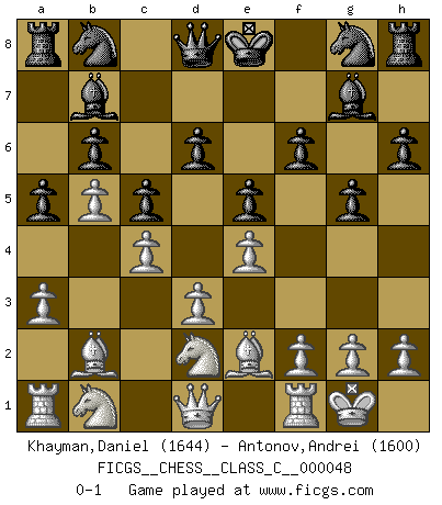 Last move : 0-1 2007 August 19 20:15:16 [Event "FICGS__CHESS__CLASS_C__000048"] [Site "FICGS"] [Date "2007.06.26"] [Round "1"] [White "Khayman,Daniel"] [Black "Antonov,Andrei"] [Result "0-1"] [WhiteElo "1644"] [BlackElo "1600"] 1.b4 e6 2.Bb2 f6 3.a3 a5 4.b5 c5 5.e4 b6 6.Nf3 Bb7 7.d3 e5 8.Be2 d6 9.c4 h6 10.O-O g5 11.Nfd2 Bg7 0-1 Comment by player 1 : Daniel Khayman : good bye Polish (Sokolsky) opening Kingside Castling by player White (move 10) Player Black won this chess game. Follow this game move after move (download)Your body has to be in top condition. Your Chess deteriorates as your body does. You can't separate body from mind. (Bobby Fischer) In der Schule lernt man nichts. Es ist nur Zeitverschwendung. (Robert James Fischer) Cuando tu no sabes absolutamente que mas hacer, es tiempo de entrar en pánico. (John van der Wiel) On n'a jamais que l'âge auquel on a commence à jouer aux échecs car après on cesse de vieillir. (Capablanca) This is where the fun begins. (Anakin Skywalker in Star Wars ep.3)