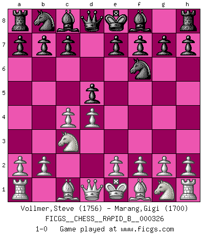 Last move : 1-0 2019 October 31 23:52:16 [Event "FICGS__CHESS__RAPID_B__000326"] [Site "FICGS"] [Date "2019.09.29"] [Round "1"] [White "Vollmer,Steve"] [Black "Marang,Gigi"] [Result "1-0"] [WhiteElo "1756"] [BlackElo "1700"] 1.d4 d5 2.c4 Nf6 3.Nc3 1-0 This chess game has been lost on time (started : 2019.09.29 11:35:40) QGD : Marshall defense Player White won this chess game. Follow this game move after move (download)I look one move ahead... the best ! (Siegbert Tarrasch) Ich rechne überhaupt nicht voraus. Ich gewinne auch so. (Robert James Fischer) Por esta medida (el intervalo entre Fischer y sus contemporaneos), yo le considero el mas grande campeón mundial. (Garry Kasparov) L'action d'une oeuvre littéraire se déroule sur un champ de bataille. Les masques et les types du drame moderne correspondent aux pièces du jeu d'échecs. L'intrigue correspond aux coups et aux gambits, c'est à dire aux techniques du jeu telles qu'utilisées et interprétées par les joueurs. Les tactiques et les péripéties [mouvements] correspondent aux coups exécutés par l'adversaire. (Viktor Shklovsky) All maxims have their antagonist maxims; proverbs should be sold in pairs, a single one being but a half truth. (William Mathews)