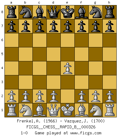 Last move : 1-0 2019 October 30 6:43:7 [Event "FICGS__CHESS__RAPID_B__000326"] [Site "FICGS"] [Date "2019.09.29"] [Round "1"] [White "Frenkel,Alex"] [Black "Vazquez,Juan Manuel"] [Result "1-0"] [WhiteElo "1966"] [BlackElo "1700"] 1.e4 1-0 This chess game has been lost on time (started : 2019.09.29 11:35:40) King's pawn Opening Player White won this chess game. Follow this game move after move (download)My God, Bobby Fischer plays so simply. (Alexei Suetin) Wenn ich mich einlogge, glauben die Leute gewöhnlich nicht, dass ich es selbst bin und sie fangen an, mir dumme Fragen zu stellen. Und wenn sie es glauben, stellen sie wieder andere dumme Fragen. (Judith Polgar) Creo que una cierta cantidad de temperamento es esperada de los genios del Ajedrez. (Ron Gross) Le profane ne songe pas à la somme de jouissance dont il se prive, qui méconnaît ce jeu aux ressources aussi variées que passionnantes. (Jean-Marie Jeanton-Lamarche) He who defends everything defends nothing. (Frederick the Great)