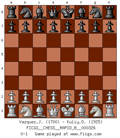 Last move : 0-1 2019 October 29 15:27:39 [Event "FICGS__CHESS__RAPID_B__000326"] [Site "FICGS"] [Date "2019.09.29"] [Round "1"] [White "Vazquez,Juan Manuel"] [Black "Kuliy,Oleksandr"] [Result "0-1"] [WhiteElo "1700"] [BlackElo "1925"] 0-1 This chess game has been lost on time (started : 2019.09.29 11:35:40) Player Black won this chess game. Follow this game move after move (download)I played Chess with him and would have beaten him sometimes only he always took back his last move, and ran the game out differently. (Mark Twain) Mit sehr nachdenklichem Gesicht schreitet Bobby durch den Turniersaal. Was ist passiert?, fragt Lombardy. Ich stehe schlecht, antwortet Fischer. Lombardy: Dann biete doch einfach Remis an. Fischer: So schlecht stehe ich nun auch wieder nicht! (Robert James Fischer) Un sacrificio se refuta mucho mejor al aceptarlo. (Wilhelm Steinitz) Lorsque vous vous retrouvez devant une position atroce, ne tendez pas un ultime piège dérisoire avec l'intention d'abandonner si l'adversaire le déjoue ! Faites-vous plutôt un devoir de résister comme si votre vie en dépendait. Jouez le coup qui vous déplairait au centuple si vous étiez dans la peau de votre tortionnaire ! Perfection is achieved, not when there is nothing more to add, but when there is nothing left to take away. (Antoine de Saint-Exupéry)