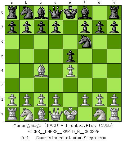 Last move : 0-1 2019 October 31 23:52:16 [Event "FICGS__CHESS__RAPID_B__000326"] [Site "FICGS"] [Date "2019.09.29"] [Round "1"] [White "Marang,Gigi"] [Black "Frenkel,Alex"] [Result "0-1"] [WhiteElo "1700"] [BlackElo "1966"] 1.e4 e5 2.Bc4 Nf6 0-1 This chess game has been lost on time (started : 2019.09.29 11:35:40) Bishop's Opening : Berlin defense Player Black won this chess game. Follow this game move after move (download)Chess is the gymnasium of the mind. (Blaise Pascal) Dass jemand wie Surab Asmaiparaschwili, der selbst Elopunkte gekauft hat , Vize-Präsident der Fide werden konnte, sagt schon einges über den Zustand dieser Organisation aus. (Joel Lautier) Una buena memoria, concentración, imaginación y una fuerte voluntad, se requiere para llegar a ser un buen jugador. (Bobby Fischer) Le système Elo représente seulement une moyenne. Il est simplement un indicateur de votre stabilité. (Anatoli Karpov) Life is the sum of all your choices. (Albert Camus)