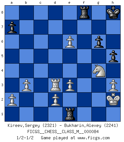 Last move : 1/2-1/2 2020 January 4 10:28:9 [Event "FICGS__CHESS__CLASS_M__000084"] [Site "FICGS"] [Date "2019.10.01"] [Round "1"] [White "Kireev,Sergey"] [Black "Bukharin,Alexey"] [Result "1/2-1/2"] [WhiteElo "2321"] [BlackElo "2241"] 1.e4 e5 2.Nf3 Nc6 3.Bc4 Nf6 4.Ng5 d5 5.exd5 Na5 6.Bb5+ c6 7.dxc6 bxc6 8.Bd3 Nd5 9.Nf3 Bd6 10.O-O Nf4 11.Re1 Nxd3 12.cxd3 O-O 13.Nc3 Re8 14.Ne4 c5 15.b3 Bf8 16.Ba3 f5 17.Ng3 Nc6 18.Rc1 f4 19.Ne4 Bg4 20.h3 Bh5 21.g4 fxg3 22.Nxg3 Bg6 23.Bxc5 Qd5 24.Bxf8 Rxf8 25.Re3 Rf4 26.Ne2 Rf6 27.Ng5 Kh8 28.Ne4 Bxe4 29.dxe4 Qf7 30.Ng3 Rf8 31.Nf5 Qd7 32.R1c3 g6 33.Rcd3 Qc8 34.Nh4 Nd4 35.Nf3 Qc2 36.Qxc2 Nxc2 37.Nxe5 Nxe3 38.fxe3 Rf2 39.Ng4 Re2 40.e5 h5 41.e6 Re1+ 42.Kh2 1/2-1/2 Two knights defense Kingside Castling by player White (move 10) Kingside Castling by player Black (move 12) This chess game ended in a draw. Follow this game move after move (download)A great player and a great example for many. His book My 60 Memorable Games had a big impact on me. It is a shame he didn't continue to enrich the world of chess with his unparalleled understanding after 1972. (Jan Timman, about Bobby Fischer's death) Ja, ich habe einmal eine Blitzpartie gespielt, es war in einem Zug, 1929. --im Interview 1989 (Mikhail Moiseyevich Botvinik) El Ajedrez moderno está demasiado preocupado con cosas como la estructura de Peones. Olvidenlo, el Jaque Mate termina la partida. (Nigel Short) Les échecs, c'est l'imagination. (David Bronstein) If computers get too powerful, we can organize them into committees. That'll do them in. (Anonymous)
