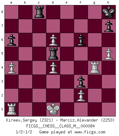 Last move : 1/2-1/2 2019 October 12 17:58:9 [Event "FICGS__CHESS__CLASS_M__000084"] [Site "FICGS"] [Date "2019.10.01"] [Round "1"] [White "Kireev,Sergey"] [Black "Marciz,Alexander"] [Result "1/2-1/2"] [WhiteElo "2321"] [BlackElo "2253"] 1.e4 c5 2.Nf3 Nc6 3.Nc3 e5 4.Bc4 d6 5.d3 Be7 6.Nd2 Bg5 7.h4 Bh6 8.Qh5 g6 9.Qd1 Nf6 10.Nd5 Nh5 11.g4 Nf4 12.Nb1 Be6 13.Nbc3 Nd4 14.Be3 Bg7 15.h5 gxh5 16.gxh5 Bh6 17.Nxf4 exf4 18.Bxd4 cxd4 19.Nb5 Qb6 20.c3 dxc3 21.bxc3 O-O 22.Qb3 d5 23.exd5 Bd7 24.Nd4 Qa5 25.a4 f3 26.Kd1 b5 27.Bxb5 Bxb5 28.Nxb5 Rab8 29.Rg1+ Kh8 30.Qb2 a6 31.c4 f6 32.Qc3 Rxb5 33.Qxa5 Rxa5 34.d4 Rc8 35.c5 Bf4 36.d6 Bxd6 37.cxd6 Rd5 38.Rg4 1/2-1/2 Sicilian defense Kingside Castling by player Black (move 21) This chess game ended in a draw. Follow this game move after move (download)There's never before been a Chess player with such a thorough knowledge of the intricacies of the game and such an absolutely indomitable will to win. I think Bobby is the greatest player that ever lived. (Lisa Lane) Im Fernschach kannst du während dem Spiel rauchen. (John Christen Knudsen) Debemos de asegurarnos de que el Ajedrez no se convierta en un lenguaje muerto, muy interesante, pero tan solo para un grupo muy pequeño. (Sytze Faber) Si le désir cupide (et stupide) de gagner est une inépuisable source de souffrance, une combinaison brillante sur l'échiquier est une découverte : le coquelicot qui s'épanouit lorsque apparaît la Voie Lactée. (Arrabal) Gambling : The sure way of getting nothing from something. (Wilson Mizner)