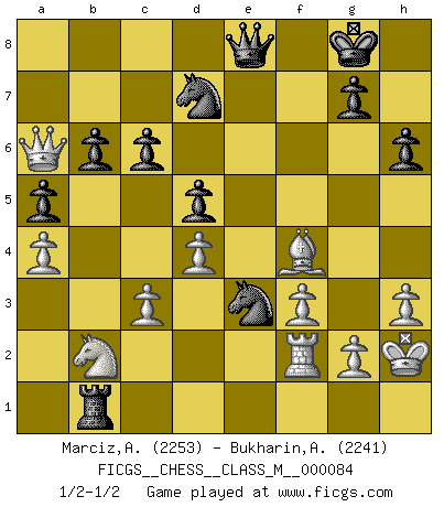 Last move : 1/2-1/2 2020 January 19 16:52:10 [Event "FICGS__CHESS__CLASS_M__000084"] [Site "FICGS"] [Date "2019.10.01"] [Round "1"] [White "Marciz,Alexander"] [Black "Bukharin,Alexey"] [Result "1/2-1/2"] [WhiteElo "2253"] [BlackElo "2241"] 1.d4 Nf6 2.c4 e6 3.Nc3 Bb4 4.f3 O-O 5.e4 d5 6.e5 Nfd7 7.cxd5 exd5 8.a3 Bxc3+ 9.bxc3 f6 10.exf6 Qxf6 11.Ne2 Nb6 12.a4 Nc6 13.Ng3 Na5 14.Qc2 Bd7 15.Bd3 Rae8+ 16.Kf2 Qh4 17.Rf1 Nbc4 18.Kg1 Rf7 19.Ra2 b6 20.Qb1 Nd6 21.Re2 Rxe2 22.Nxe2 Bf5 23.Nf4 c6 24.Bxf5 Nxf5 25.Nd3 Nc4 26.Bf4 h6 27.Qc1 Qd8 28.h3 a5 29.Qb1 Nh4 30.Rf2 Qe8 31.Bg3 Nf5 32.Bf4 Nh4 33.Qd1 Re7 34.Kh2 Ng6 35.Bc1 Nf8 36.Bf4 Nd7 37.Nb2 Re1 38.Qd3 Ne3 39.Qa6 Rb1 40.Qd3 Re1 41.Qa6 Rb1 1/2-1/2 Comment by player 1 : Alexander Marciz : Леха,завязывай бухать )) Nimzo-Indian : Kmoch variation Kingside Castling by player Black (move 4) This chess game ended in a draw. Follow this game move after move (download)Every Chess master was once a beginner. (Chernev) Sie bekommen vielleicht den Eindruck, dass die Spitzenspieler überhaupt gar nicht so stark sind. Aber das stimmt nicht. Es ist eine Illusion. Mit einem Computer an der Seite ist es sehr leicht, Urteile zu fällen, aber wenn man alleine am Brett sitzt, sieht die Sache ganz anders aus. (Vladimir Kramnik) Puntos débiles o agujeros en la posición de tu oponente deben de ser ocupados por piezas, no Peones. (Siegbert Tarrasch) La conception d'un plan est le processus par lequel un joueur exploite les avantages de sa position tout en s'efforçant d'en réduire au minimum les inconvénients. Afin de garantir le succès, un plan doit toujours se fonder sur un diagnostic objectif des particularités d'une position. La conception d'un plan est d'autant plus difficile que la position est équilibrée, et grandement facilitée lorsqu'il n'existe qu'un seul plan susceptible de répondre aux exigences de la position. (Harry Golombek) Computers make it easier to do a lot of things, but most of the things they make it easier to do don't need to be done. (Andy Rooney)