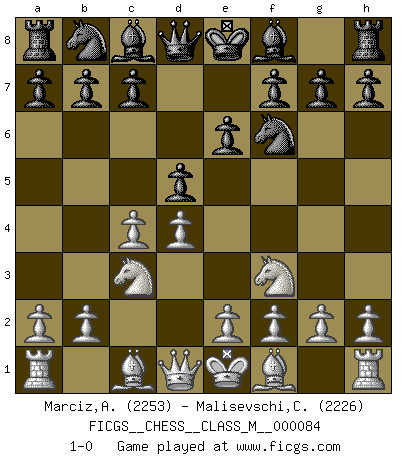 Last move : 1-0 2019 November 11 16:22:23 [Event "FICGS__CHESS__CLASS_M__000084"] [Site "FICGS"] [Date "2019.10.01"] [Round "1"] [White "Marciz,Alexander"] [Black "Malisevschi,Cristian"] [Result "1-0"] [WhiteElo "2253"] [BlackElo "2226"] 1.d4 Nf6 2.Nf3 e6 3.c4 d5 4.Nc3 1-0 This chess game has been lost on time (started : 2019.10.01 15:54:39) Queen's pawn game Player White won this chess game. Follow this game move after move (download)Do you realize Fischer almost never has any bad pieces? He exchanges them, and the bad pieces remain with his opponents. (Yuri Balashov) Nie in meinem Leben habe ich die französische Verteidigung gespielt, welche die Stumpfsinnigste von allen ist. (Wilhelm Steinitz) La batalla por la última verdad nunca sera ganada. Y es por eso que el Ajedrez es tan fascinante. (Hans Kmoch) Les Cavaliers se révèlent fort utiles dans les positions fermées. D'habitude, les Fous sont un peu plus forts que les Cavaliers dans les positions ouvertes. Qu'on le veuille ou non, il restera toujours des exceptions ! Luck is what you have left over after you give 100 percent. (Langston Coleman)