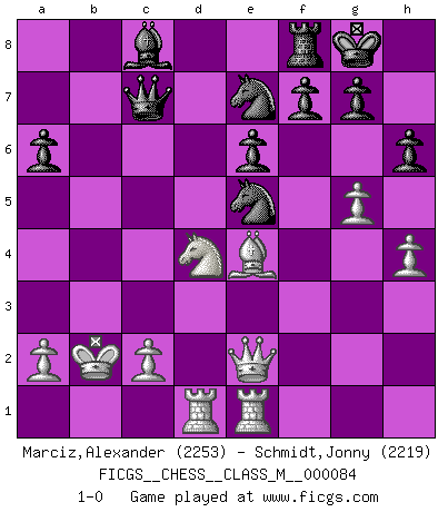 Last move : 1-0 2019 December 26 10:2:0 [Event "FICGS__CHESS__CLASS_M__000084"] [Site "FICGS"] [Date "2019.10.01"] [Round "1"] [White "Marciz,Alexander"] [Black "Schmidt,Jonny"] [Result "1-0"] [WhiteElo "2253"] [BlackElo "2219"] 1.Nf3 c5 2.e4 d6 3.d4 cxd4 4.Nxd4 Nf6 5.Nc3 a6 6.Bg5 Nbd7 7.Qe2 e6 8.f4 Qc7 9.O-O-O Be7 10.g4 b5 11.Bg2 b4 12.e5 bxc3 13.Bxa8 dxe5 14.fxe5 Nd5 15.Bxe7 cxb2+ 16.Kxb2 Nxe7 17.Be4 Nxe5 18.Rhe1 h6 19.h4 O-O 20.g5 1-0 This chess game has been lost on time (started : 2019.10.01 15:54:39) Reti Opening Queenside Castling by player White (move 9) Kingside Castling by player Black (move 19) Player White won this chess game. Follow this game move after move (download)There are tough players and nice guys, and I'm a tough player. (Bobby Fischer) Habe Mut, dich deines eigenen Verstandes zu bedienen. (Immanuel Kant) ¿Que sería del Ajedrez sin errores graciosos?. (Kurt Richter) Les échecs, c'est l'imagination. (David Bronstein) The problem with troubleshooting is that trouble shoots back. (Anonymous)