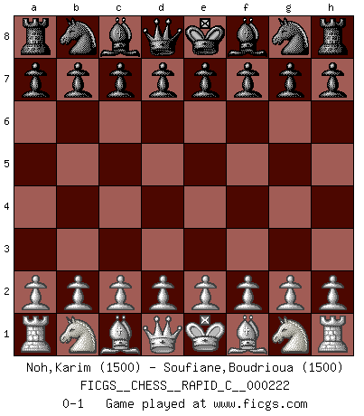 Last move : 0-1 2019 October 31 23:52:16 [Event "FICGS__CHESS__RAPID_C__000222"] [Site "FICGS"] [Date "2019.10.01"] [Round "1"] [White "Noh,Karim"] [Black "Soufiane,Boudrioua"] [Result "0-1"] [WhiteElo "1500"] [BlackElo "1500"] 0-1 This chess game has been lost on time (started : 2019.10.01 23:13:0) Player Black won this chess game. Follow this game move after move (download)Chess opens and enriches your mind. (Saudin Robovic) Ich weiss nicht was Gott gegen mich auf 1.e4 antworten würde. (Robert James Fischer) El Ajedrez es realmente noventa y nueve por ciento calculación. (Soltis) Des combinaisons [dans le jeu d'échecs] pareilles à des mélodies. Je crois entendre pour ainsi dire la musique des coups... (Vladimir Nabokov) I've lost money so fast in these clubs it's left me reeling. I've read every poker book ever written, but the only way to get better at the game is to go out and play with people who are really good. The problem is, you stand to lose a lot of money doing it. (Matt Damon)