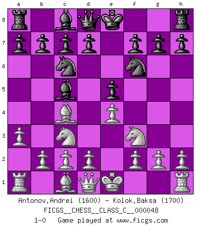 Last move : 1-0 2007 August 13 3:26:47 [Event "FICGS__CHESS__CLASS_C__000048"] [Site "FICGS"] [Date "2007.06.26"] [Round "1"] [White "Antonov,Andrei"] [Black "Kolok,Baksa"] [Result "1-0"] [WhiteElo "1600"] [BlackElo "1700"] 1.e4 e5 2.Nc3 Bc5 3.Nf3 Nc6 4.Bc4 Nf6 5.a3 1-0 This chess game has been lost on time (started : 2007.06.26 12:55:44) Vienna game Player White won this chess game. Follow this game move after move (download)I thought the most common mistake [in chess] was the first one: Learning the game :P (Garvin Gray, FICGS forum) Nach Morphy wurde nichts neues mehr in der Behandlung offener Positionen gefunden. (Mikhail Moiseyevich Botvinik) El Ajedrez es un cuento de Hadas de las 1001 metidas de pata. (Savielly Tartakower) J'ai vu le vaincu d'Echecs jouer des années durant dans l'espoir de la fête de la victoire. Car tu es plus riche de ce qu'elle existe si même elle n'est point pour toi. Ainsi de la perle du fond des mers. (Antoine de Saint-Exupéry) In God we trust, all others we virus scan. (Anonymous)