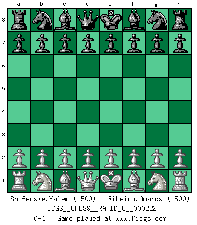 Last move : 0-1 2019 October 31 23:52:16 [Event "FICGS__CHESS__RAPID_C__000222"] [Site "FICGS"] [Date "2019.10.01"] [Round "1"] [White "Shiferawe,Yalem"] [Black "Ribeiro,Amanda"] [Result "0-1"] [WhiteElo "1500"] [BlackElo "1500"] 0-1 This chess game has been lost on time (started : 2019.10.01 23:13:0) Player Black won this chess game. Follow this game move after move (download)A player surprised is half beaten. (Proverb) Kasparov ist eine Art Monster mit hundert Augen, denen auch nicht das Geringste entgeht. (Tony Miles) Todos los Maestros de Ajedrez fueron un día unos principiantes. (Chernev) Roi des jeux et jeu des rois, les échecs portent en eux un sentiment d'infini. Ils donnent à celui qui s'est efforcé d'en approfondir les arcanes l'impression de n'être pas à la mesure de l'homme; en fait, ils constituent un résumé de l'univers, un microcosme, et figurent cette grande échelle qui, dans les plans de la lumière descend jusqu'à la matière, qui des abîmes insondables remonte jusqu'en l'infini de Dieu. (Pyrame) You must have a dream in order to have it come true. (A.P.J. Kalam)