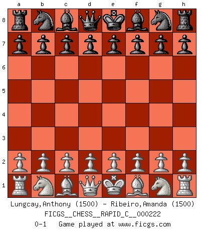 Last move : 0-1 2019 October 31 23:52:16 [Event "FICGS__CHESS__RAPID_C__000222"] [Site "FICGS"] [Date "2019.10.01"] [Round "1"] [White "Lungcay,Anthony"] [Black "Ribeiro,Amanda"] [Result "0-1"] [WhiteElo "1500"] [BlackElo "1500"] 0-1 This chess game has been lost on time (started : 2019.10.01 23:13:0) Player Black won this chess game. Follow this game move after move (download)Modern Chess is too much concerned with things like Pawn structure. Forget it, Checkmate ends the game. (Nigel Short) Ein bischen Romantik kann weder im Schach noch in der Liebe schaden. Also versuche ich mich ab und zu daran zu erinnern. (Nigel Short) Los Peones son nacidos libres, y aún así, se encuentran encadenados por todos lados. (Rick Kennedy) Donnez-moi un Cavalier en 6e et je gagnerais toutes mes parties. (Steinitz) It is not true that people stop pursuing dreams because they grow old, they grow old because they stop pursuing dreams. (Gabriel Garcia Marquez)